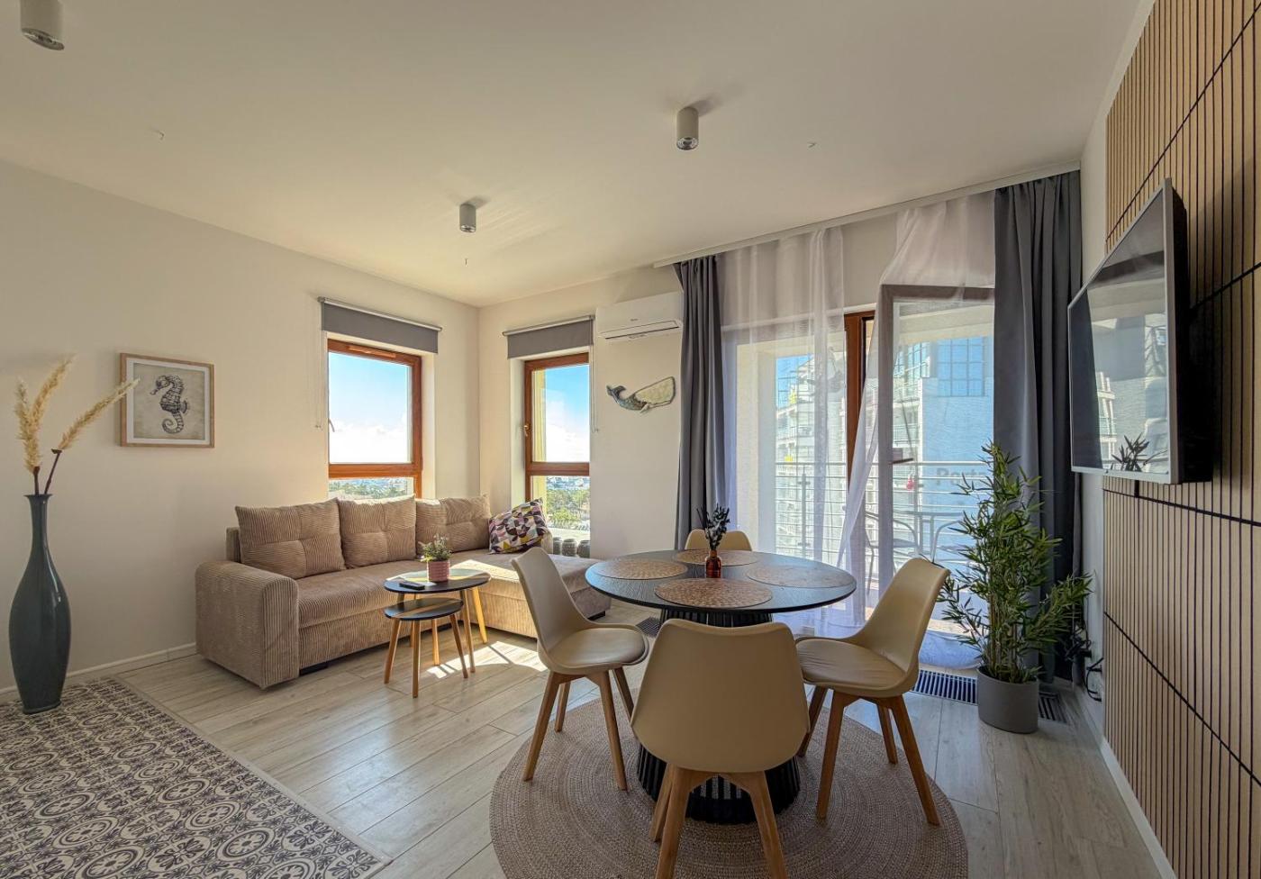 Apartament z 1 sypialnią. This air-conditioned apartment comprises 1 living room, 1 separate bedroom and 1 bathroom with a shower. Meals can be prepared in the well-fitted kitchenette, which comes with a stovetop, a refrigerator, a dishwasher and kitchenware. The apartment provides a washing machine, soundproof walls, a coffee machine, a flat-screen TV, as well as sea views. The unit offers 2 beds. Apartament - 4 osobowy. Powierzchnia pokoju ok.: 43 mkw.