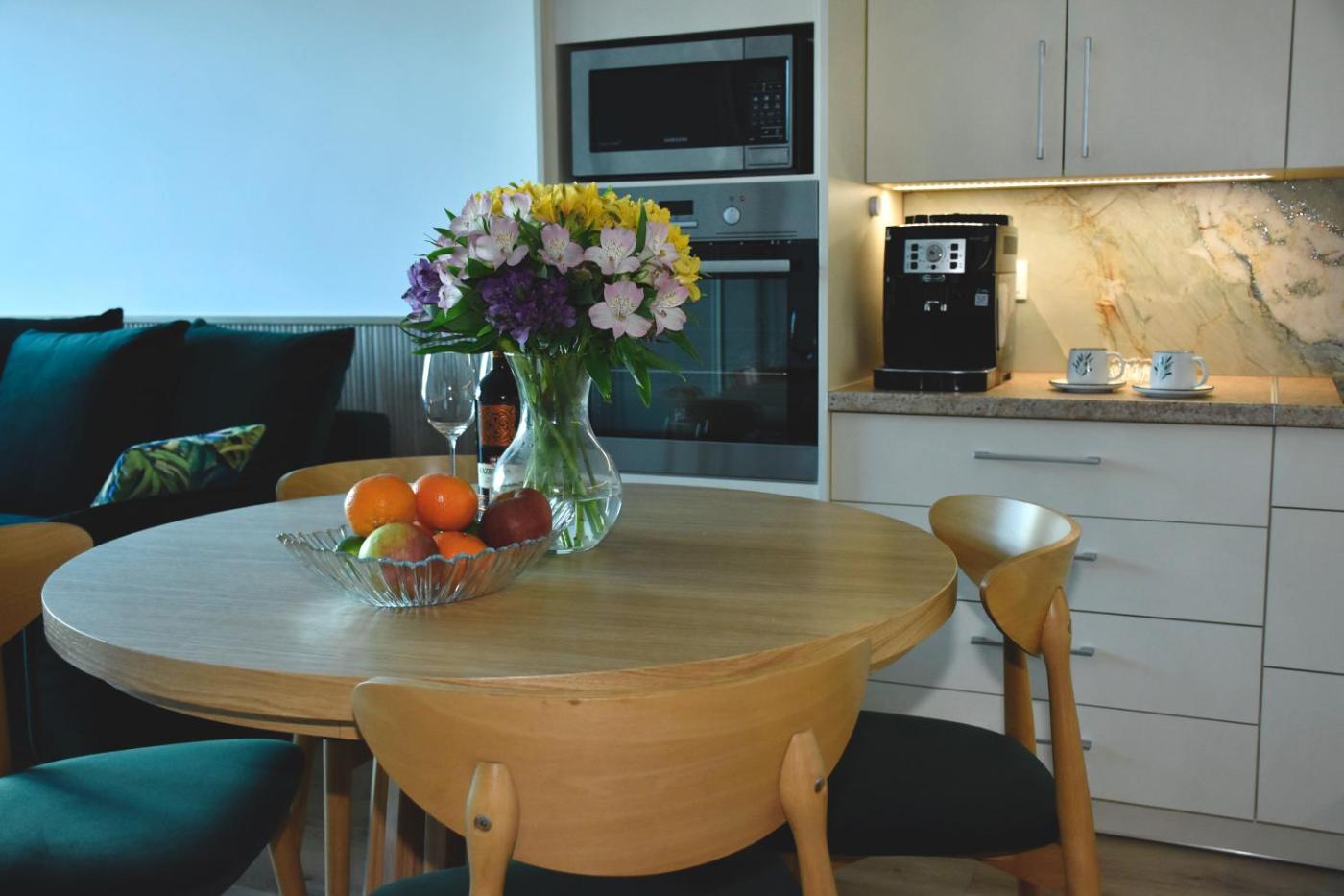 Oferta apartamentu obejmuje sypialnię (1), salon, aneks kuchenny z pełnym wyposażeniem, w tym lodówką i ekspresem do kawy, a także łazienkę (1) z prysznicem oraz bezpłatnym zestawem kosmetyków. W apartamencie zapewniono ręczniki i pościel.
