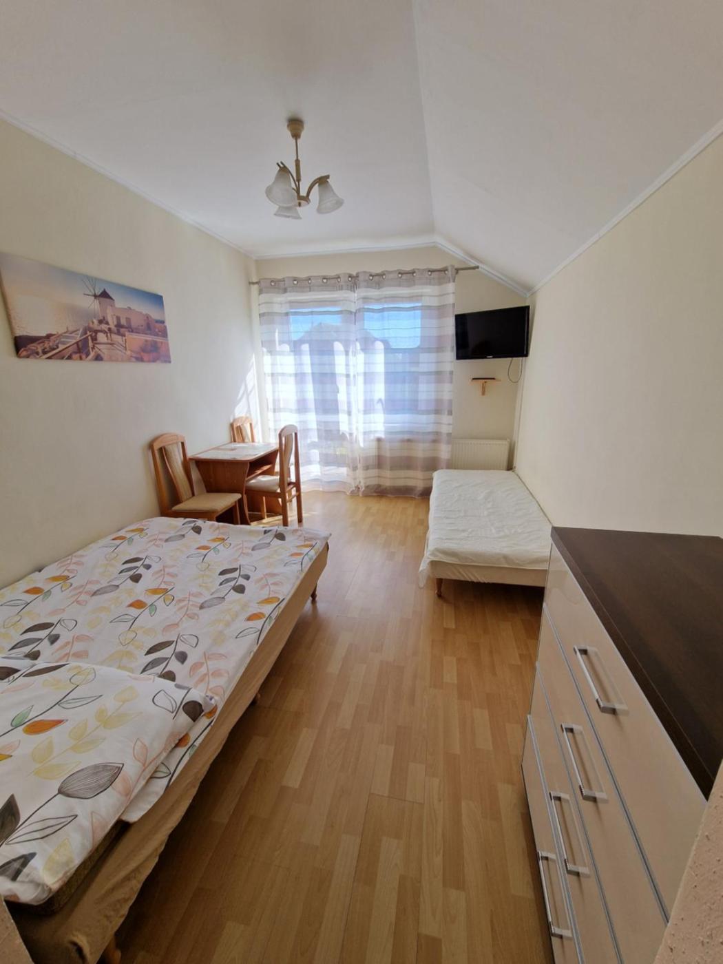 Pokój trzyosobowy z balkonem. The triple room includes a private bathroom equipped with a shower. The triple rooms kitchenette, which features a refrigerator, is available for cooking and storing food. This triple room provides a tea and coffee maker, a flat-screen TV and a balcony. The unit offers 2 beds. Powierzchnia pokoju ok.: 20 mkw. ;